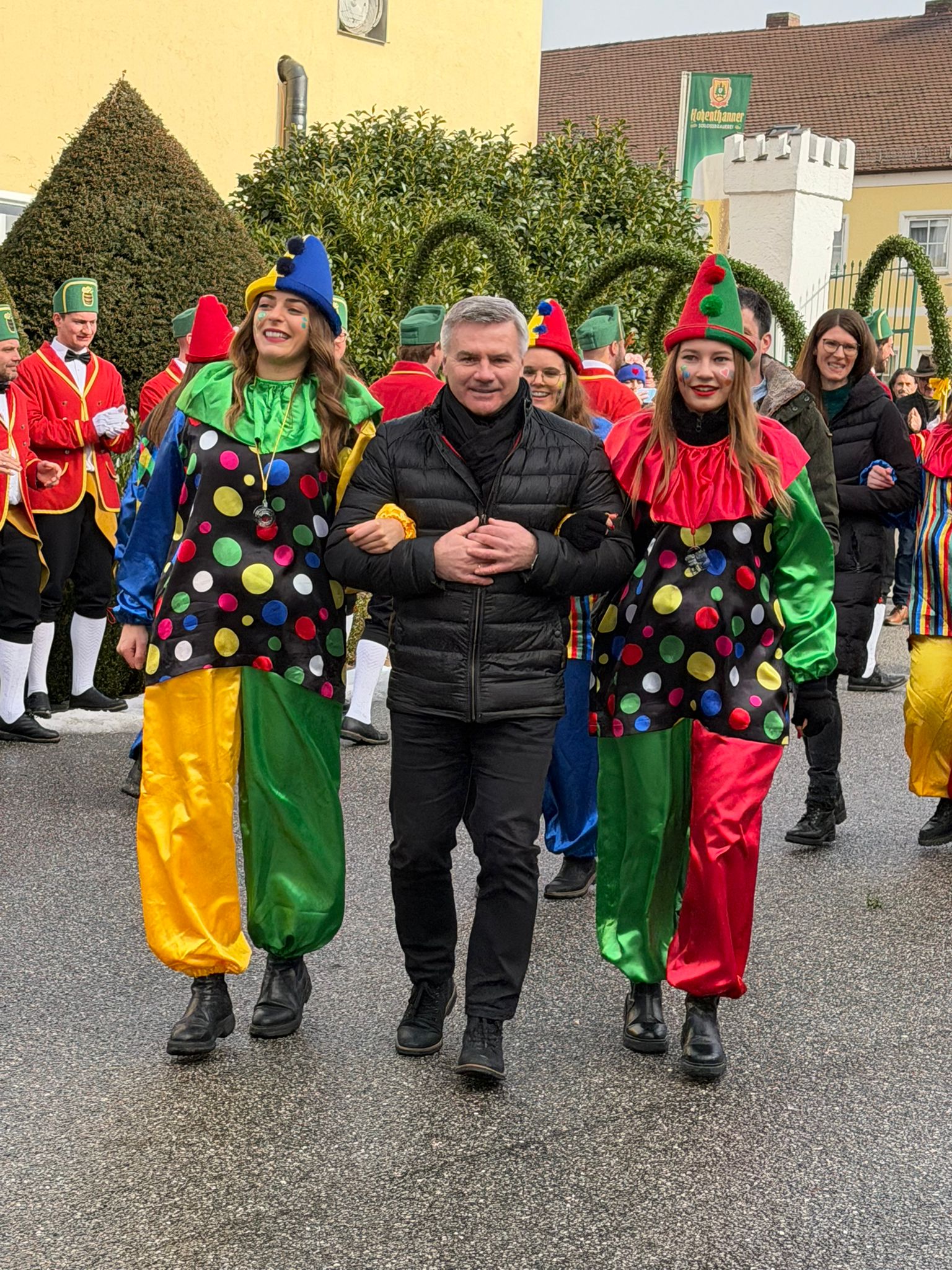 Am Sonntag Vormittag noch bei neblig, nasskaltem Wetter, zeigten die Schäffler bei MdL Ruth Müller in Pfeffenhausen, dass die Straße noch so klein und verzwickt sein kann, Ihren Auftritt aber nicht an Qualität verlieren kann. Der nächste Auftritt war dann bei der Schlossbrauerei Hohenthann. Wie auf einer Piazza und bei Sonnenschein konnten sich die Tänzer auf dem großen Hofgelände austoben. Gespannt lauschten die vielen Zuschauer über die erzählten Anekdoten über Landrat Peter Dreier und Ingrid und Johannes Rauchenecker. Landrat Peter Dreier ließ es sich nicht nehmen auch auf das Fass zu steigen und die Schäfflern zu loben und danken. Humorvoll brachte auch er die Zuschauer zum lachen und bat die Tänzer um eine kleine Zugabe, was sich die Schäffler natürlich nicht zweimal sagen lassen mussten.
