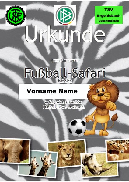 Trotz der ungemütlichen Witterung, die eher an die Tundra als an die Savanne erinnerte, gingen die Kinder mit viel Freude an die Aufgaben heran. Die zahlreichen lachenden Gesichter sprachen Bände. Da alle die Safari mit großem Eifer bestritten hatten, gab es beim Abschied auch eine Urkunde. Eine weitere Überraschung hatte der TSV parat: damit die Kinder auch im Kindergarten üben können, gab es einen Fußball als Spende.