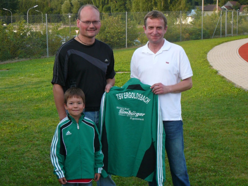 Ergoldsbach: Mit sportlichen adidas-Präsentationsanzügen gehen die Fußballer des TSV Ergoldsbach in die Saison 2010/11. Möglich gemacht hat dies die Firma Metallbau Simbürger, die sämtliche Spieler der beiden Seniorenmannschaften und die A-Jugend (!) damit ausgestattet hat. Anlässlich des Saisonauftakts gegen den FC Neufahrn erfolgte kürzlich die Übergabe. Abteilungsleiter Reiner Kappl zeigte sich hoch erfreut über die großzügige Spende, und bedankte sich bei Sponsor Markus Simbürger und Juniorchef Nico.