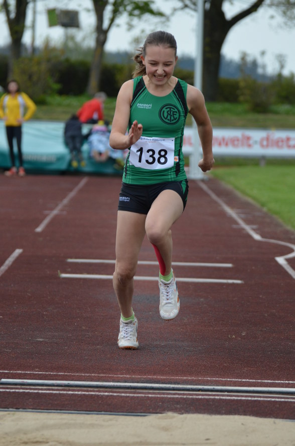 Pia Simbürger zeigte bei der U18 nach längerem Trainingsaususfall bereits wieder gute Ansätze im Weitsprung. Lena Hutzenthaler in der U18 startend war
