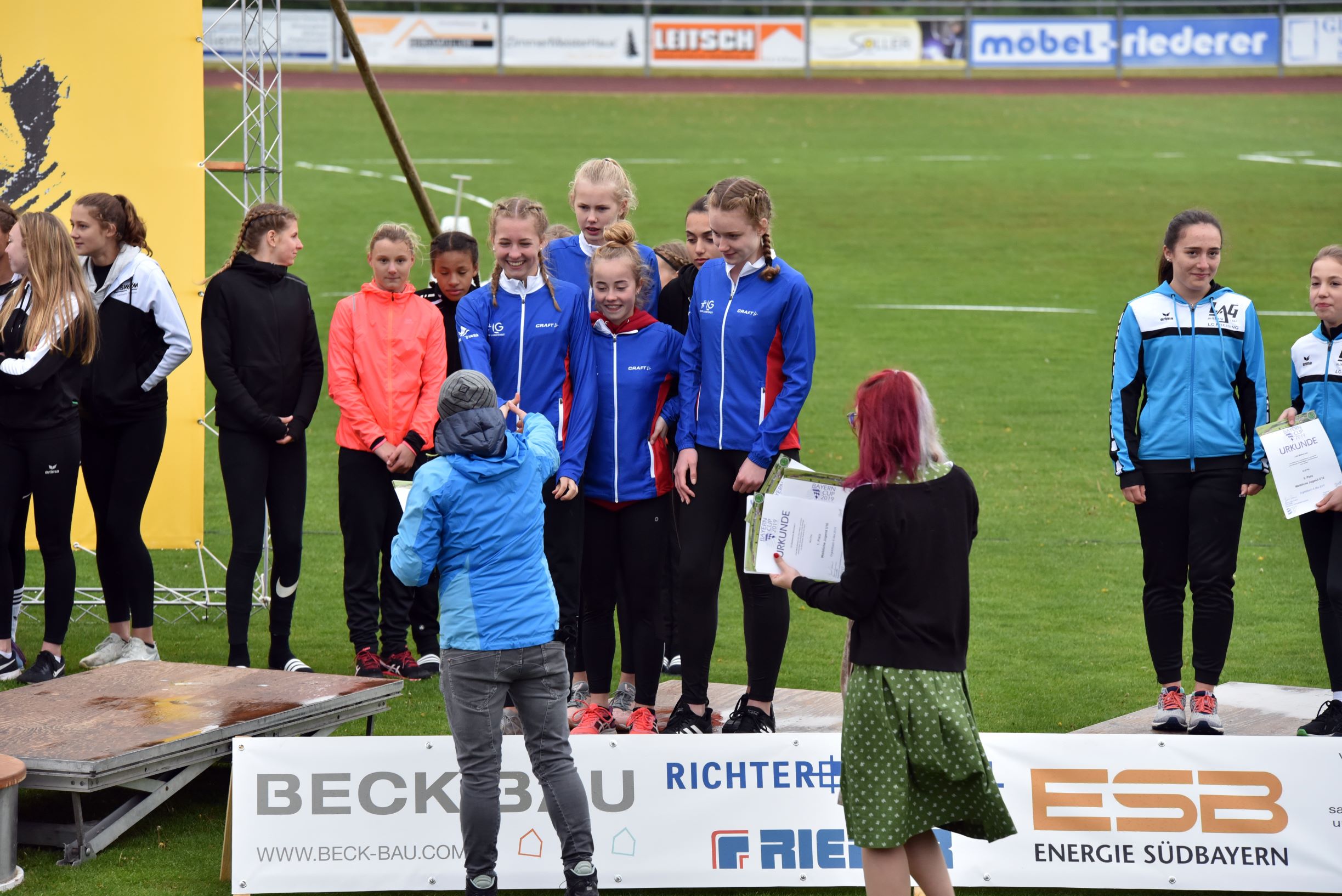 8 ergoldsbach Mädl´s starteten für zwei Mannschaften der LG Region Landshut in der Altersklasse U 16. Hierbei verfehlte die erste Mannschaft mit Platz 4 knapp das Podest. Die Zweite Mannschaft wurde in dem großen Teilnehmerfeld 10. Marie Mieslinger, Mona Simbürger, Emma Lohr, Annika Masanetz, Laura Laubner, Hannah Hummel, Lea Bendlander, und Lena Wroblewski konnten mit guten Leistungen zum jeweiligen Mannschaftsergebnis beitragen.
