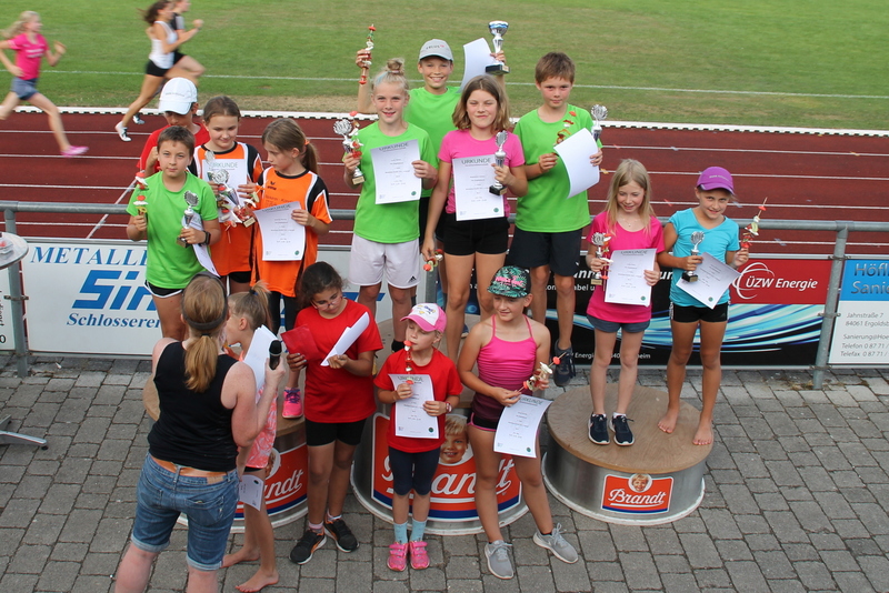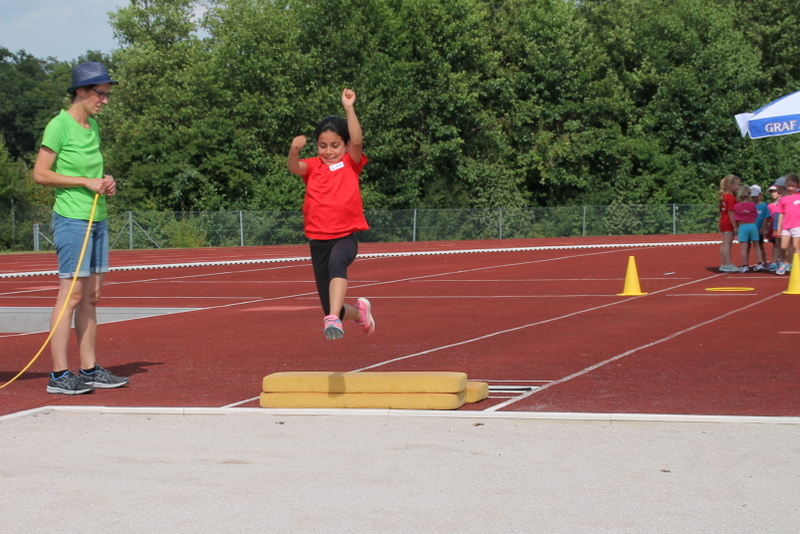 Bei sommerlich, traumhaften Bedingungen konnten die 76 Kinder in Laufen, Springen und Werfen ihr Können zeigen. Viele Eltern, Großeltern und Freunde waren gekommen und feuerten die Kinder an. Die fantastischen Ergebnisse der einzelnen Jahrgänge wurden mit Urkunden und wie jedes Jahr mit den begehrten Gummibärchenspießen belohnt. Die drei Besten jeden Jahrgangs erhielten Pokale.
