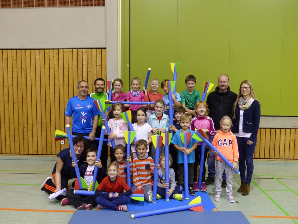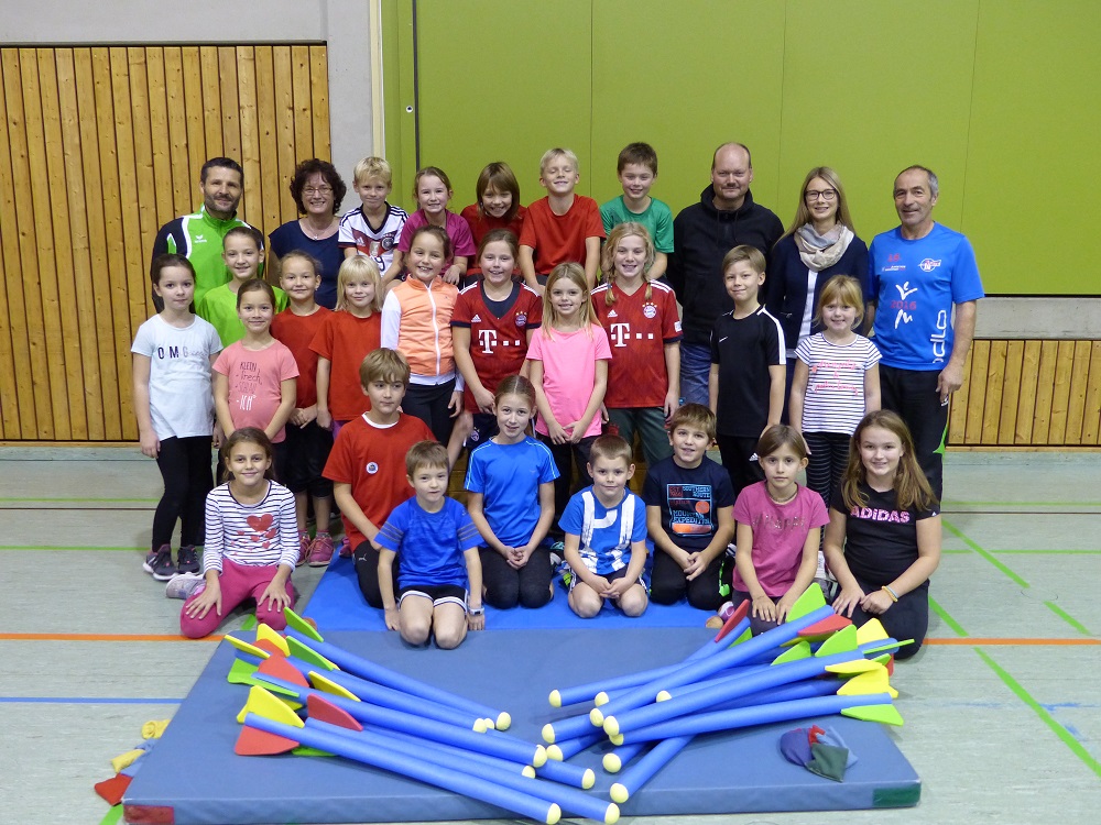 Die Kinder der Gruppe „Leichtathletik I“ mit ihren Trainern Josef Weinzierl, Dietmar Rogge und Sylvia Schwarzbaur freuen sich über neue Softspeere, mit denen sie die Wurftechnik bereits in der Hallensaison spielerisch erlernen können.