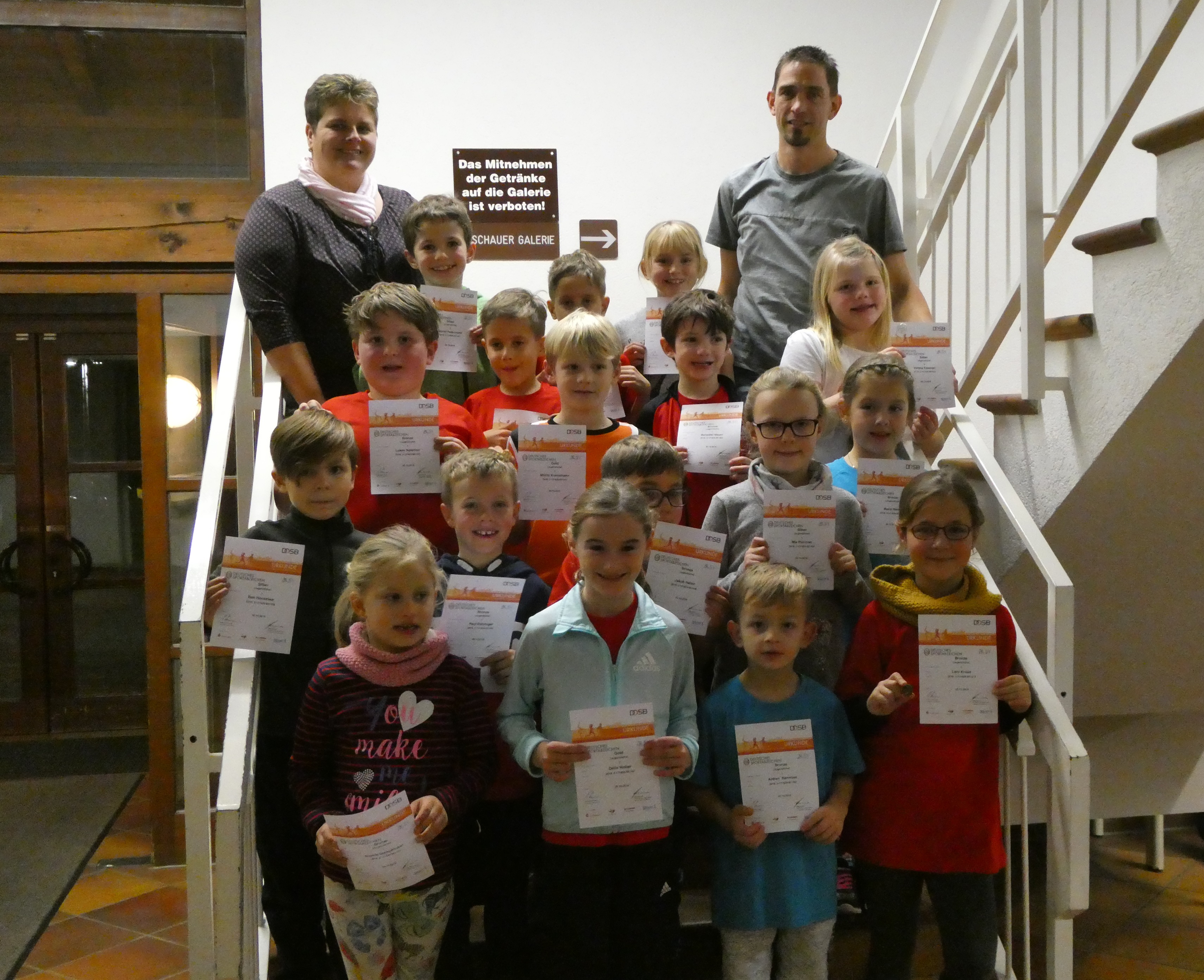 Im Rahmen der letzten Turnstunde der Leichtahtletikzwerge fand bei einer kleinen Adventsfeier in der Goldbachhalle die Verleihung der restlichen Sportabzeichen dieses Jahres statt. 26 Kinder konnten hier noch ihre Urkunden und Ehrennadeln entgegennehmen. Sie haben im Sommer im Ergoldsbacher Stadion ihre Leistungen im Standweitsprung, Zonenweitsprung bei den Laufdisziplinen in der Kurz- und Langstrecke zum Besten gebracht. Manche haben ihre Aufgaben auf´s erste Mal geschafft, andere mussten ein bisschen länger trainieren. Es erging ein großes Lob an alle Athleten für die tollen Leistungen.